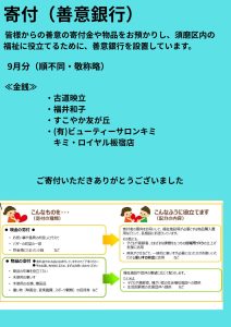 寄付(善意銀行) 皆様からの善意の寄付金や物品をお預かりし、須磨区内の 福祉に役立てるために、善意銀行を設置しています。 9月分(順不同・敬称略) ≪金銭≫ ・古道映立 ・福井和子 ・すこやか友が丘 ・(有)ビューティーサロンキミ キミ・ロイヤル板宿店 温かいご寄付を賜り、誠にありがとうございました。