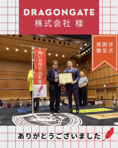 DRAGONGATE株式会社様におかれましては、長きにわたり赤い羽根共同募金を通じて地域の福祉活動を応援いただいております。昨年度、多額のご寄付をいただいたことに対し、兵庫県共同募金会会長感謝状が贈られました。